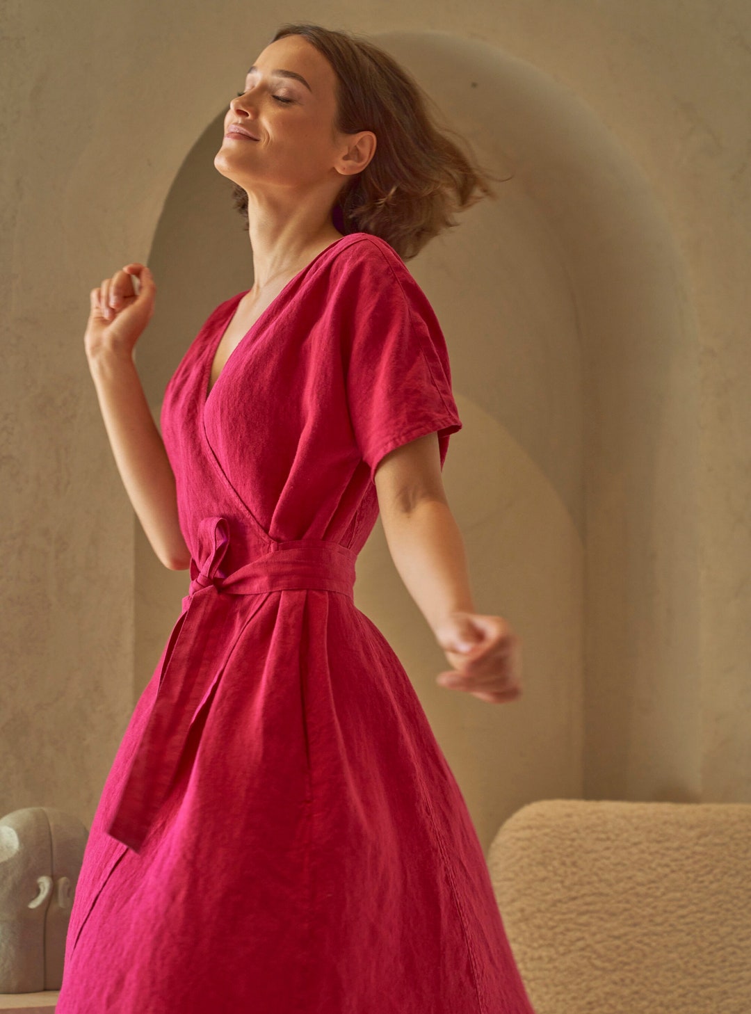 A tiny linen wrap dress in a vivid berry color is all about the passion… to dance, laugh, and live. Made from pure, organic linen, this dress will enlighten your day and make you feel special.